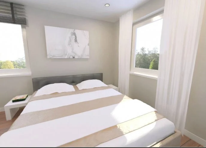 Um die obere Etage der Stadtvilla mit Erker ideal auszunutzen, wird die Fläche des zentralen Flurs auf ein Minimum begrenzt. Auf diese Weise teilt sich das Obergeschoss in insgesamt 3 Schlafzimmer, die jedes für sich über 20 m² Fläche und mindestens drei große Fenster besitzen. Auch das Badezimmer bietet genug Platz, um mehrere Waschbecken, Dusche und Badewanne zu fassen.