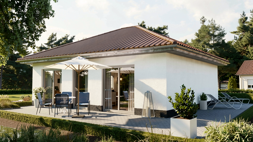 Der Bungalow Marina ist das kompakteste unter den Häusern von WilmsHaus. Mit seinen 60 Quadratmetern Wohnfläche aber groß genug für eine zwei- oder sogar dreiköpfige Familie. Das Walmdach und die vielen Fenster geben dem kleinen Wohntraum eine sympathische, offene Erscheinung.